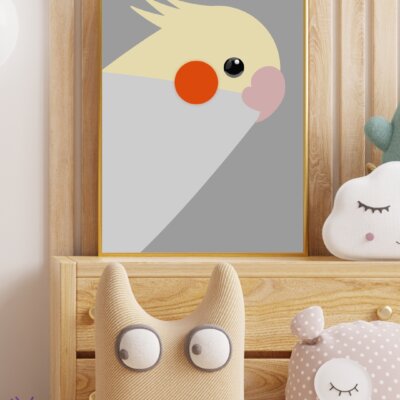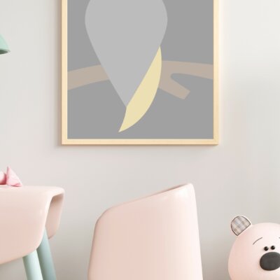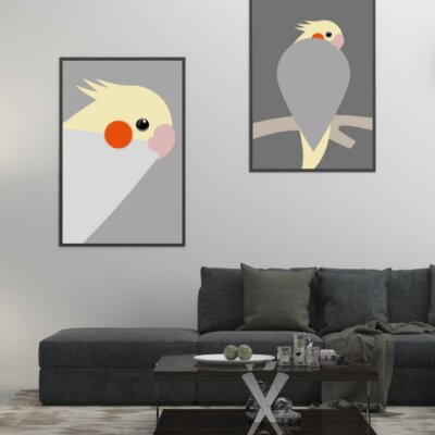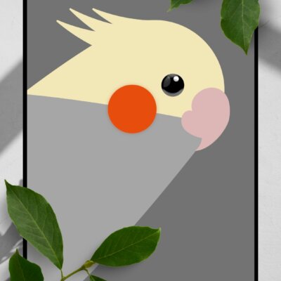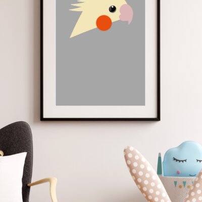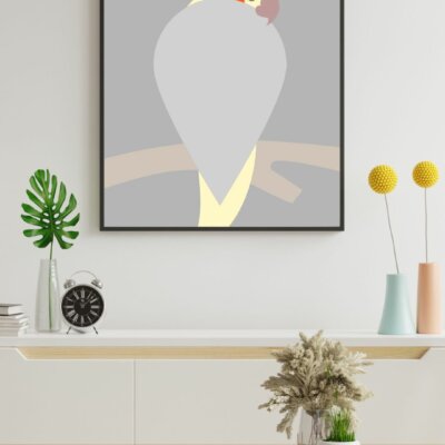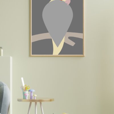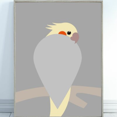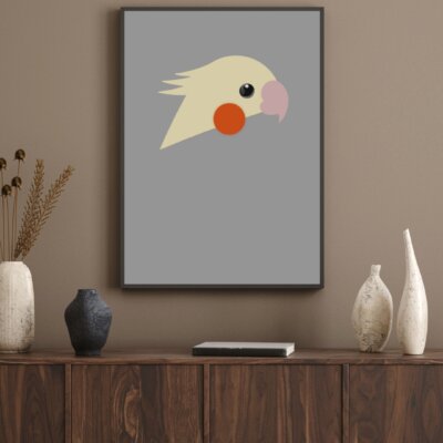 Minimalistyczny plakat z abstrakcyjnym wizerunkiem papugi Nimfy. Doskonały jako dekoracyjne dopełnienie wnętrza zarówno w pokoju dziecięcym jak i dla każdego miłośnika prostoty 😉
